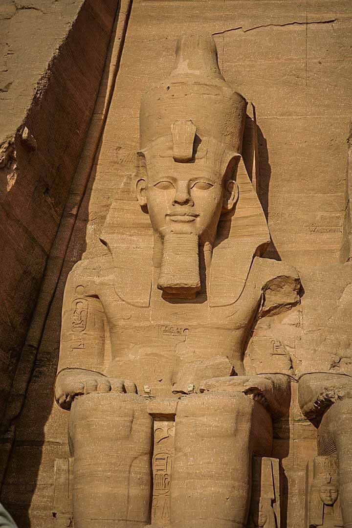 The larger temple, dedicated to the Egyptian gods, features four large statues of Ramses II on the facade and inside a mural depicting his famous victory at the battle of Kadesh.
