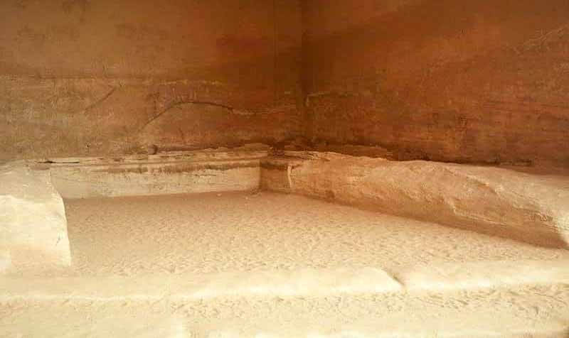 At its entrance, to the right, is a square chamber containing three stone benches that served as a triclinium (dining table with along three sides) for sacred feasts. Today, the chamber is known as al-Diwan (court).