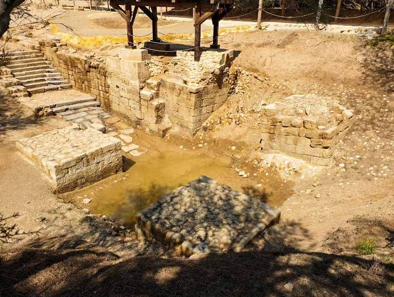 Al-Maghtas includes two principal archaeological areas.[3] The remnants of a monastery on a mound known as Jabal Mar-Elias (Elijah’s Hill) and an area close to the river with remains of churches, baptism ponds and pilgrim and hermit dwellings. The two areas are connected by a stream called Wadi Kharrar.