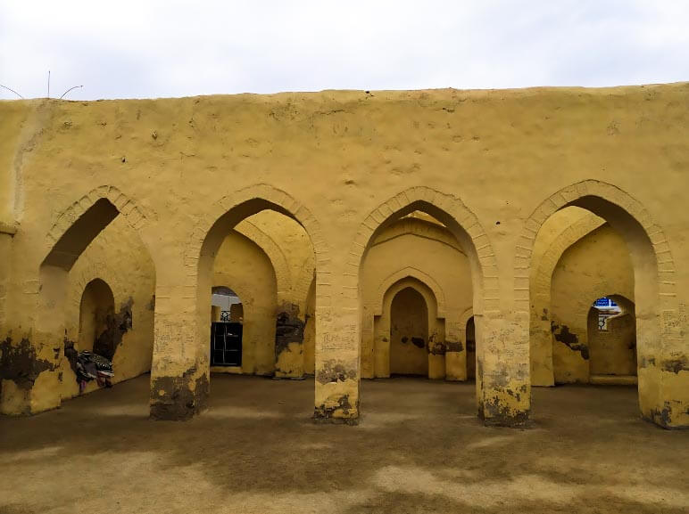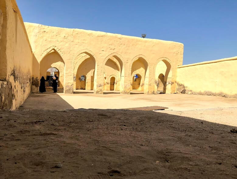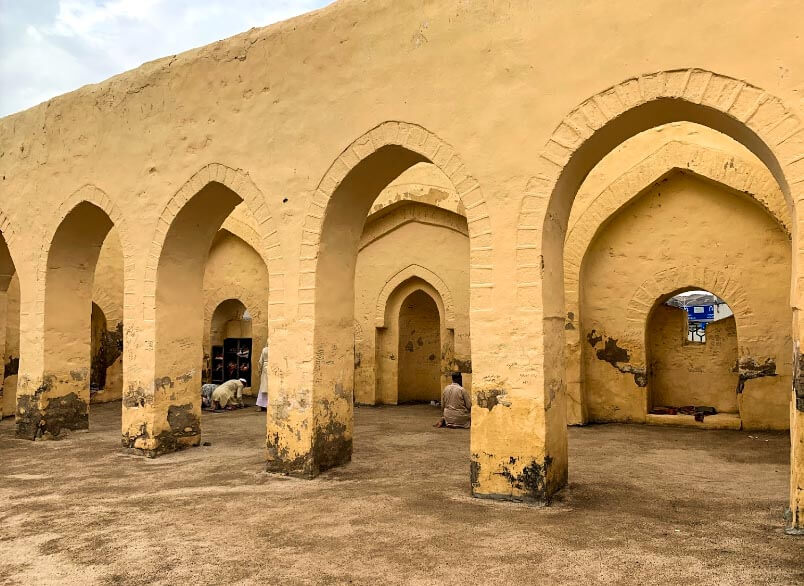 The mosque has an open courtyard. It is located below the Wadi Mina, 300 meters from the jamrah al-‘aqaba (see Stoning of the Devil), to the right of the bridge.