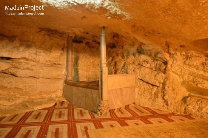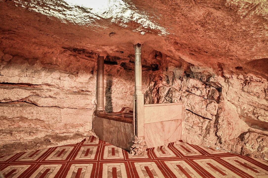 Mihrab dedicated to Hz. Ibrahim عليه اسلام is in the northern corner of the chamber. The ceiling of the cave appears natural, while the floor has been long ago paved with marble and carpeted over.