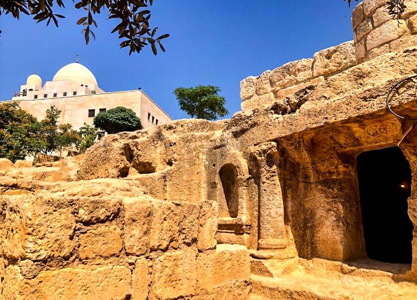To the left of the entrance is an ancient olive tree. At one time a small church was built on top of the cave; this was converted to a mosque with the mihrab still being visible above the entrance.