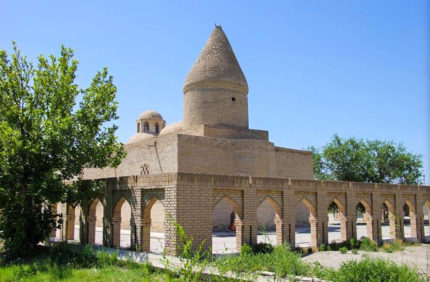 The current building was constructed during the reign of Timur and features a Khwarazm-style conical dome uncommon in Bukhara.