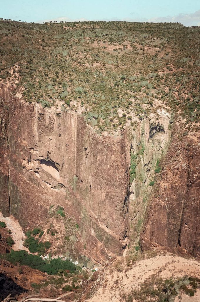 Home of the Dragon Blood Tree, Diksam Plateau, and the gorge is definitely the most spectacular limestone landscape feature on the island. The canyon drops 700 m (2295 ft) vertically to the valley floor. The plateau’s sections have partially slipped into the gorge, leaving ‘lost worlds’ accessible only to buzzards and vultures. The plateau is home to nomadic Bedouin herdsmen who move from one site to another with their herds.