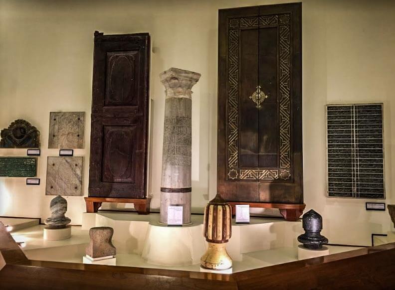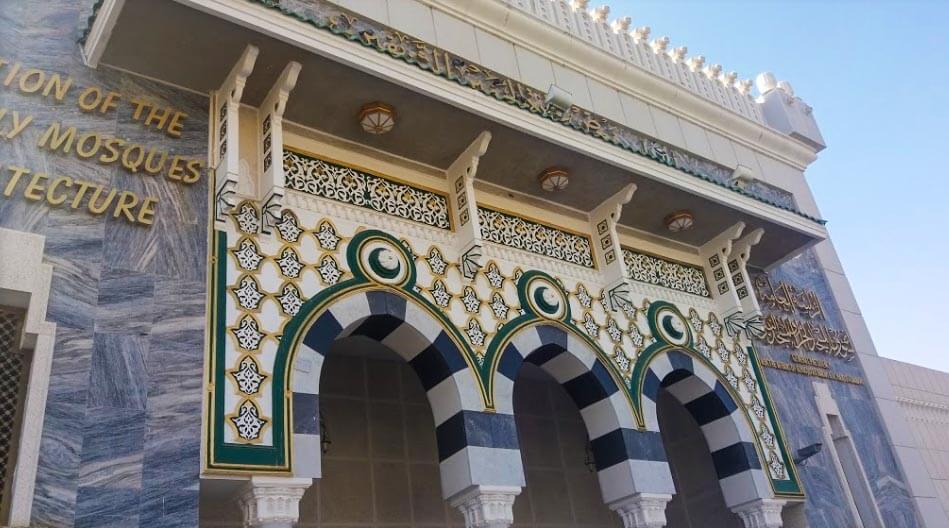 A door belonging to Prophet’s Mosque at Medina (large door at the right), dating back to the reign of King Abdul Aziz al-Saud. The door panels of an Ottoman era pulpit (smaller green door to the left with inlaid golden patterns) in Prophet’s Mosque, made at the orders of Sultan Murad III. The grill on the wall in the middle belongs to the Masjid an-Nabawi’s first Saudi construction.