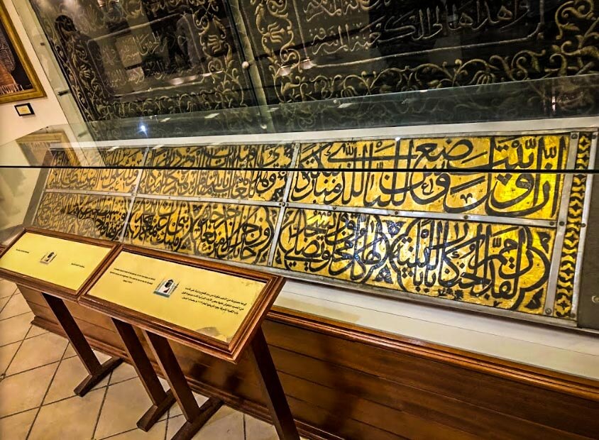 Pieces of Kiswa from different times, a piece of Kiswa (covering of the holy Ka’ba) named “Qindeel” (far left: inspect), it bears the engraved first verse of al-Fatiha (first chapter of Quran) “Al-Hamd ul-Lillah e Rabb-il ‘Aalameen” (Praise be to Allah, the Lord of the universe)