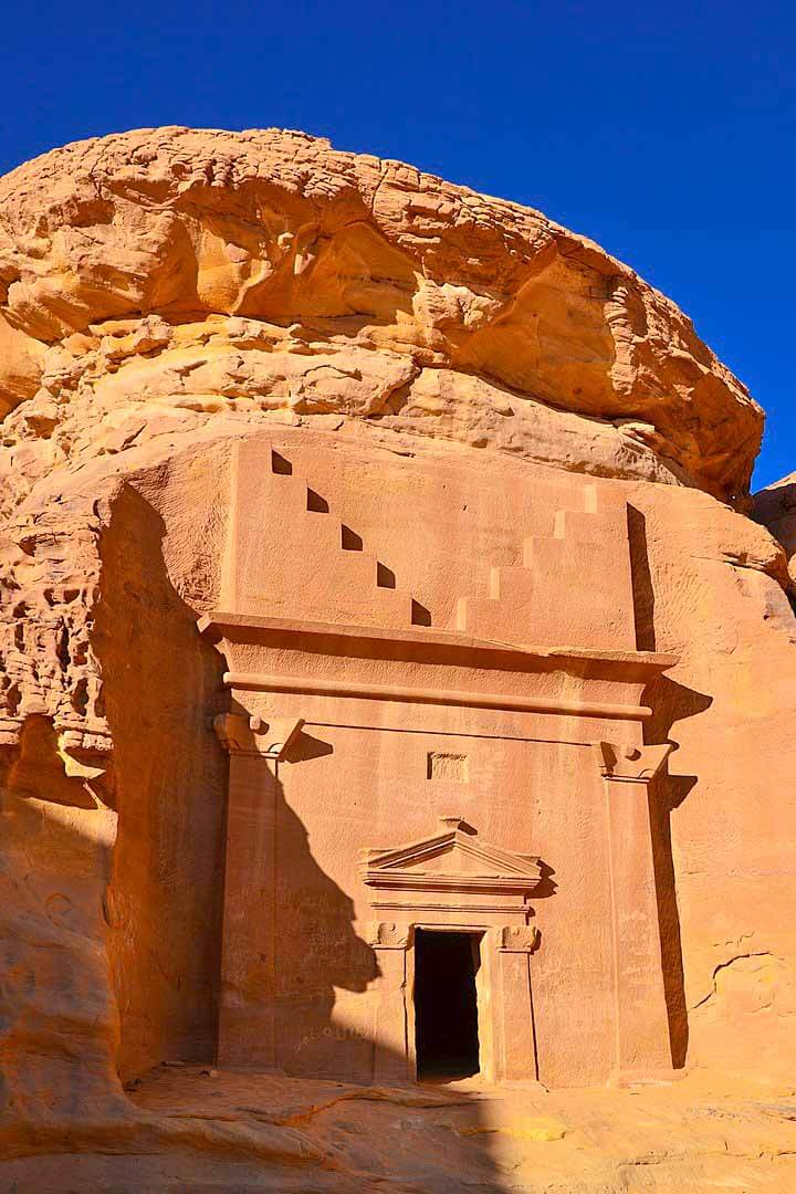According to Islamic tradition the site of Al-Hijr was settled by the tribe of Thamud, who “(took) for (themselves) palaces from its plains and (carved) from the mountains, homes”.