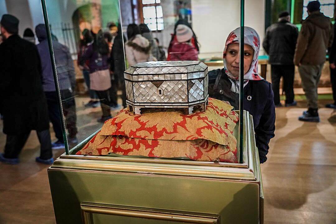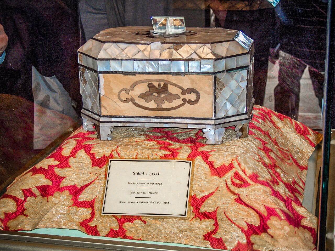 The adjoining small mosque (Masjid) is now used for the exhibition of a collection of old, illustrated Qurans and extremely valuable prayer rugs. There is also a box (Sakal-i Serif), decorated with nacre, containing the Holy Beard of Prophet Muhammad ﷺ.