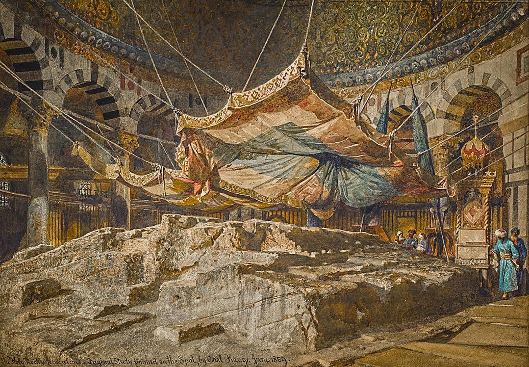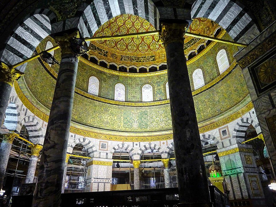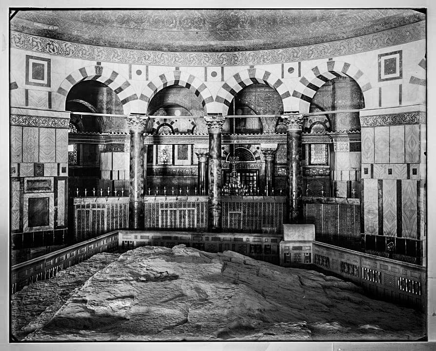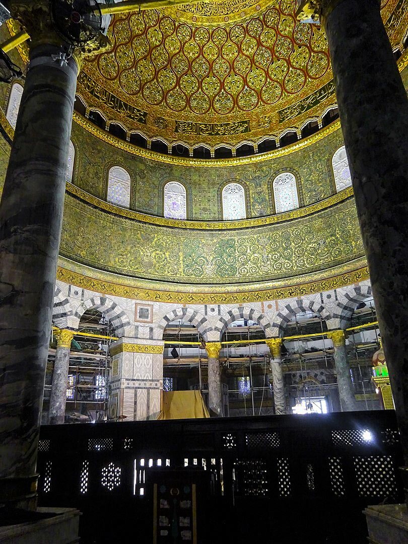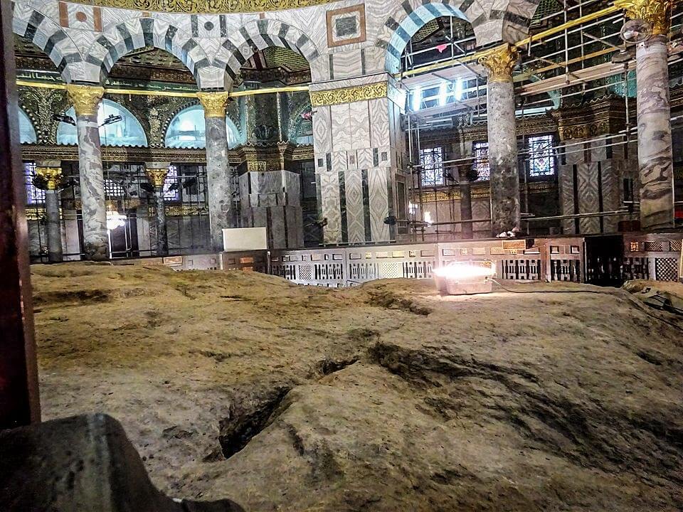 The exposed bedrock directly under the dome — known as the Noble Rock to Muslims — is the spot from which Islamic tradition indicates Prophet Muhammad ﷺ ascended to heaven, and according to Islamic tradition. T
