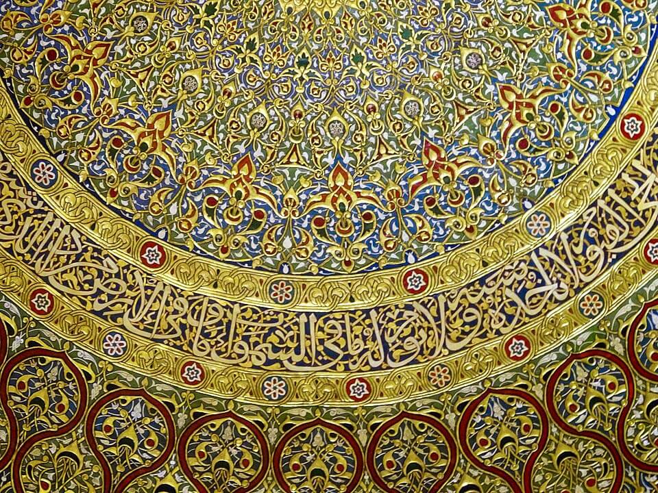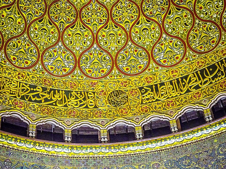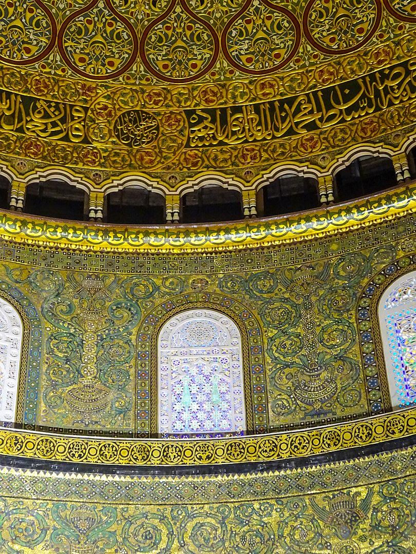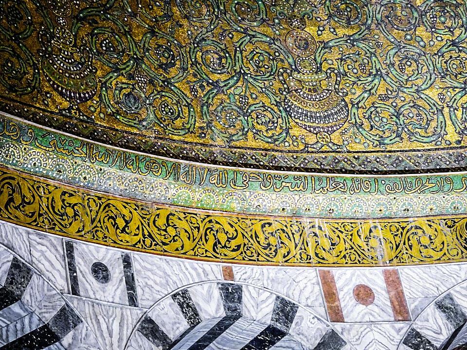 The interior of the dome is lavishly decorated with mosaic, faience and marble, much of which was added several centuries after its completion. It also contains Qur’anic inscriptions. They vary from today’s standard text (mainly changes from the first to the third person) and are mixed with pious inscriptions not in the Quran.