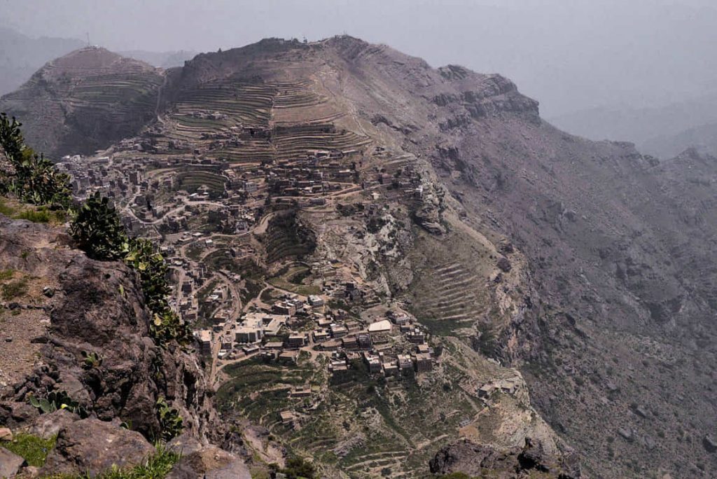 The mountain is divided into terraces of a few acres or more, separated by walls sometimes several meters high. On these terraced fields grow alfalfa for livestock, millet, lentils, large areas for coffee and qat.
