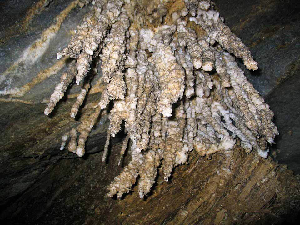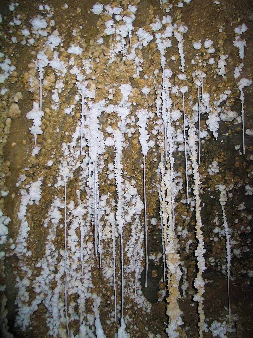The mountain is covered by a thin layer of rock, but when it rains, the water trickles down into the salt layer eventually carving out the caves and forming the stalagmites.