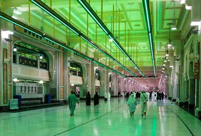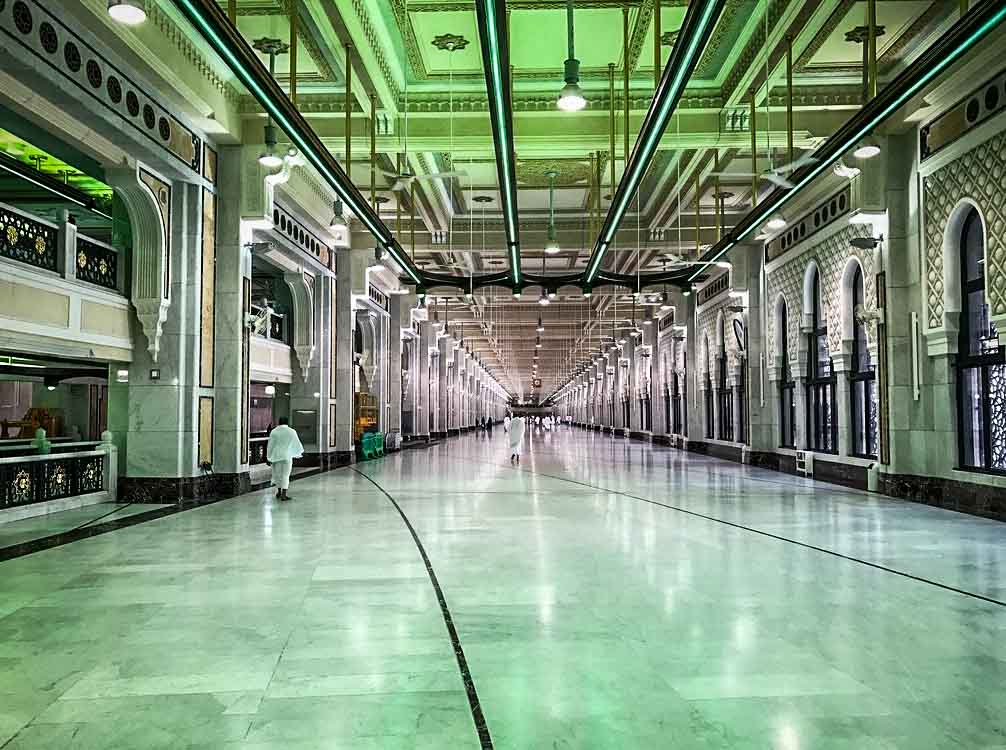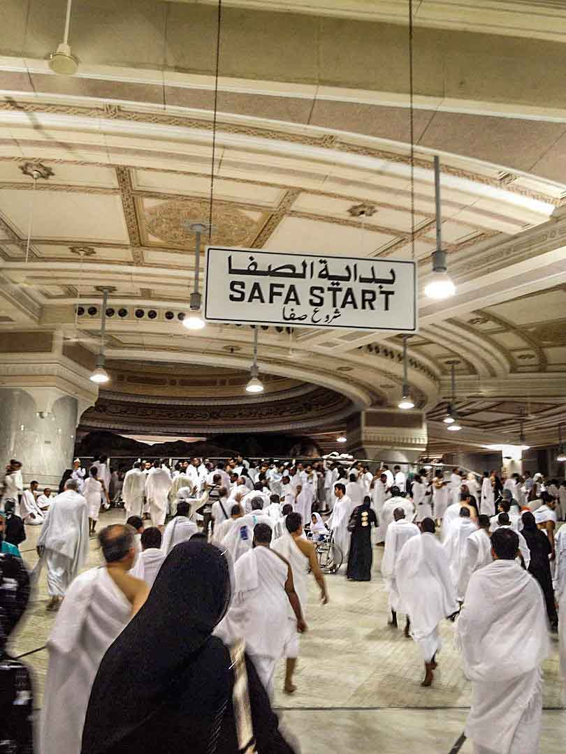 The two points and the path between al-Safa and al-Marwah are now inside a long gallery that forms part of the Masjid al-Haram. The distance between Safa and Marwa is approximately 450 meter (1,480 feet), so that seven trips back and forth amount to roughly 3.2 km.