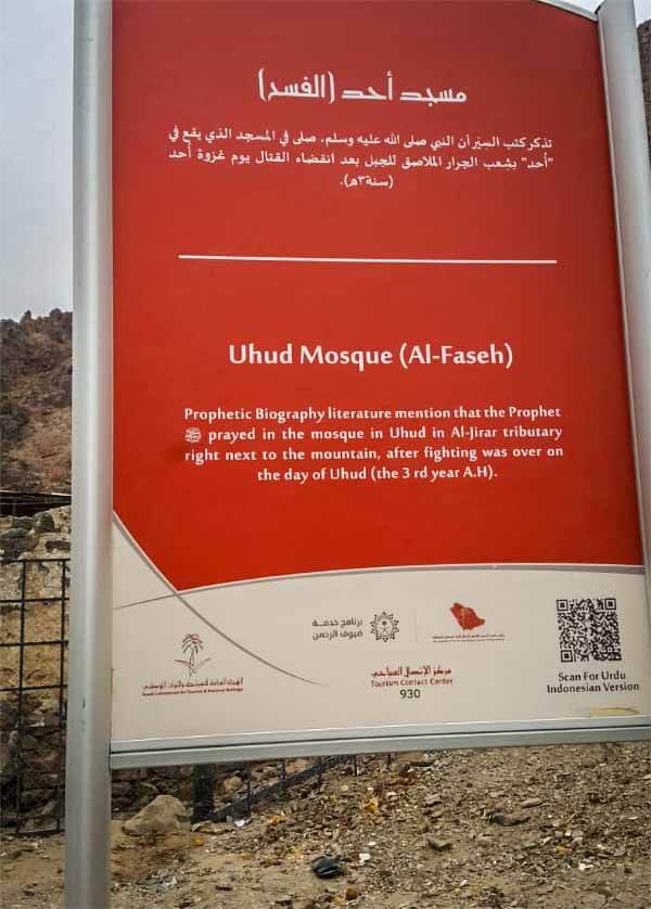 Al-Fash Mosque is a small mosque under the cave at Mount Uhud. It is reported that the Hz. Prophet Muhammad ﷺ performed Zuhr prayer sitting at its location after the fighting on the day of Uhud, because of the injuries sustained during the battle and the Muslims prayed sitting behind him.