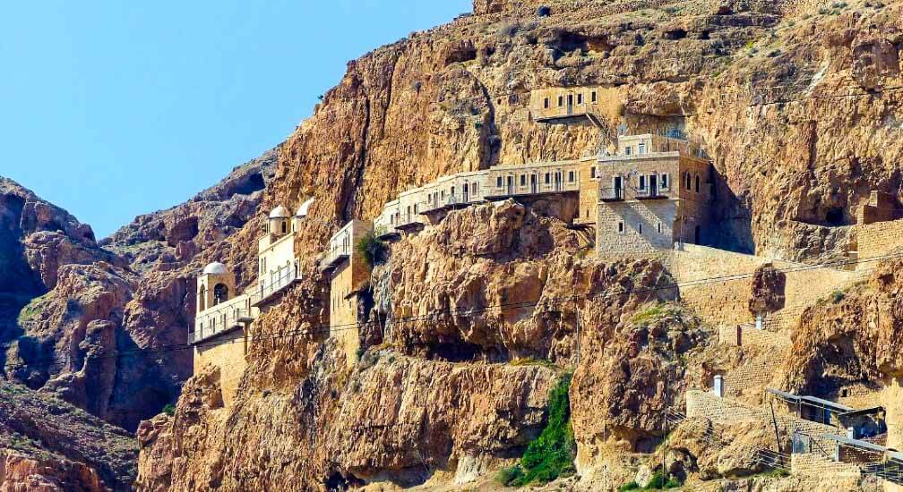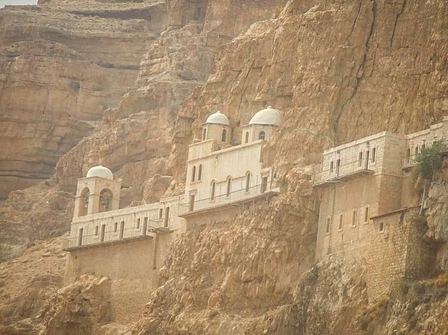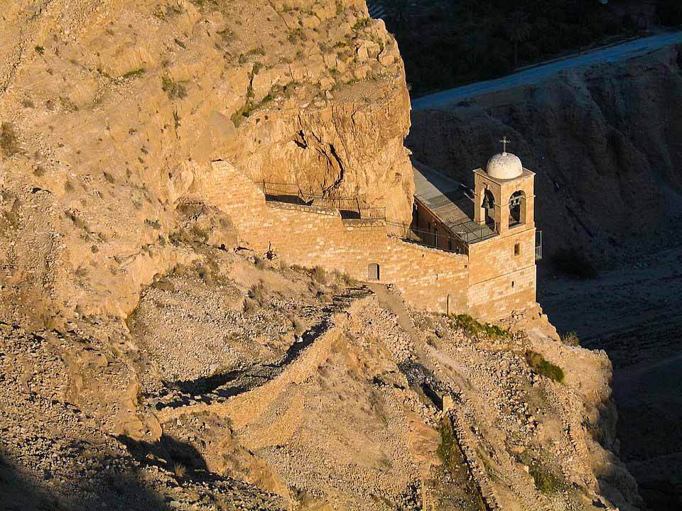 The present Monastery of the Temptation, reconstructed at the end of the 19th century, seems to grow out of the mountain. The northern half is cut into a sheer cliff, while the southern half is supported at only one end into space.