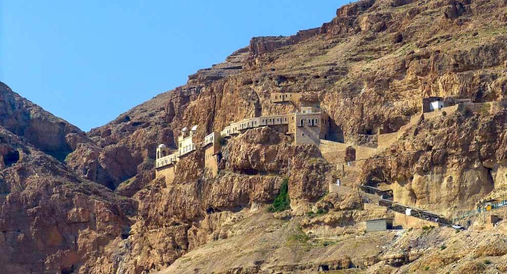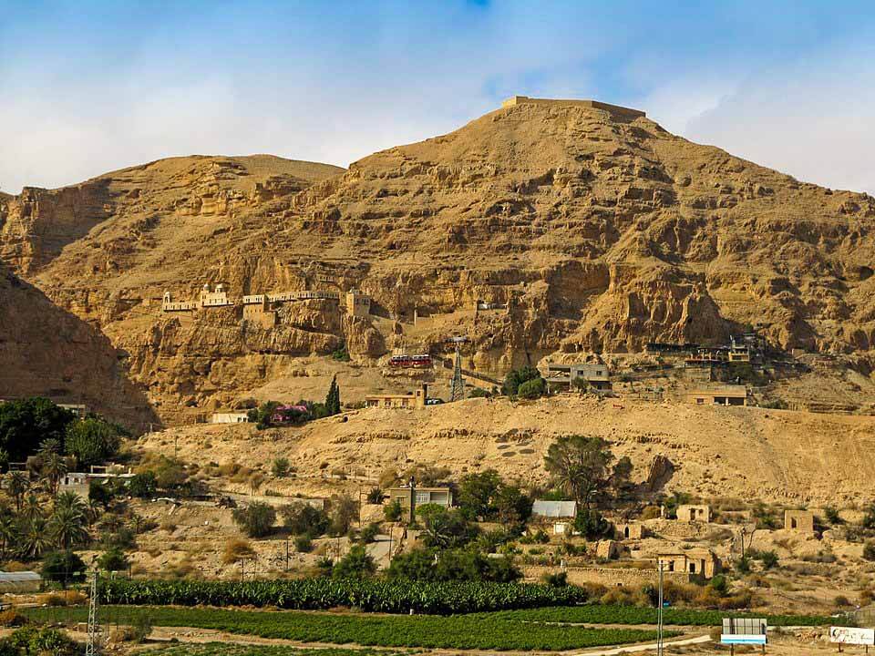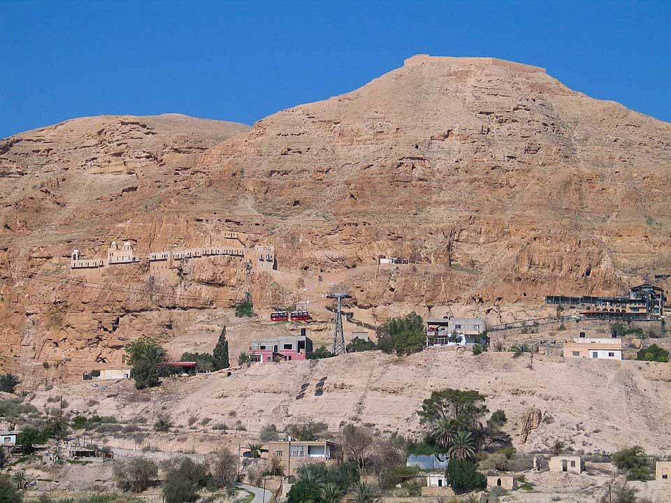 Access to the summit is by a 30-minute trek up a steep path — passing through the cliffhanging monastery on the way — or by a 5-minute cable car ride from Tel Jericho