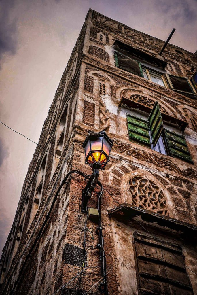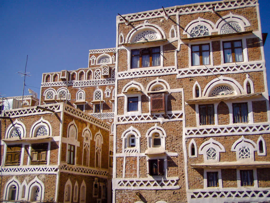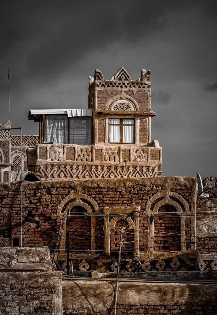 The oldest, partially standing architectural structure in the Old City of Sana’a is Ghumdan Palace. Efforts are underway to preserve some of the oldest buildings, some of which, such as the Samsarh and the Great Mosque of Sana’a, are more than 1,400 years old. Surrounded by ancient clay walls that stand 9–14 metres high, the Old City contains more than 100 mosques, 12 hammams (baths) and 6,500 houses. Many of the houses resemble ancient skyscrapers, reaching several stories high and topped with flat roofs. They are decorated with elaborate friezes and intricately carved frames and stained-glass windows.