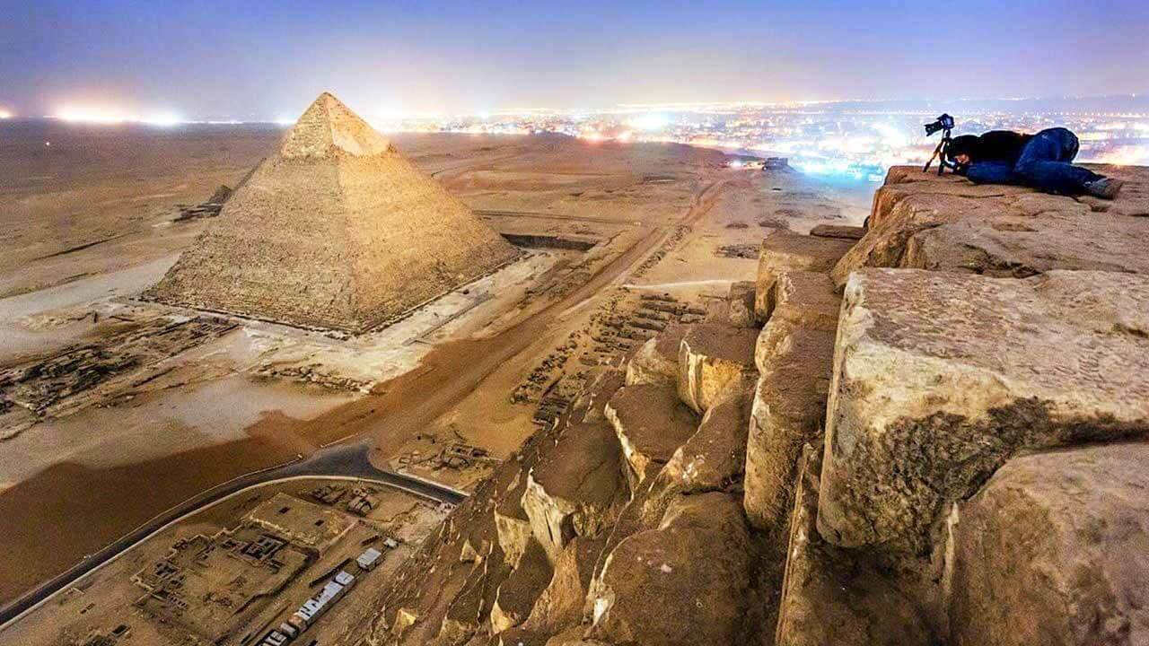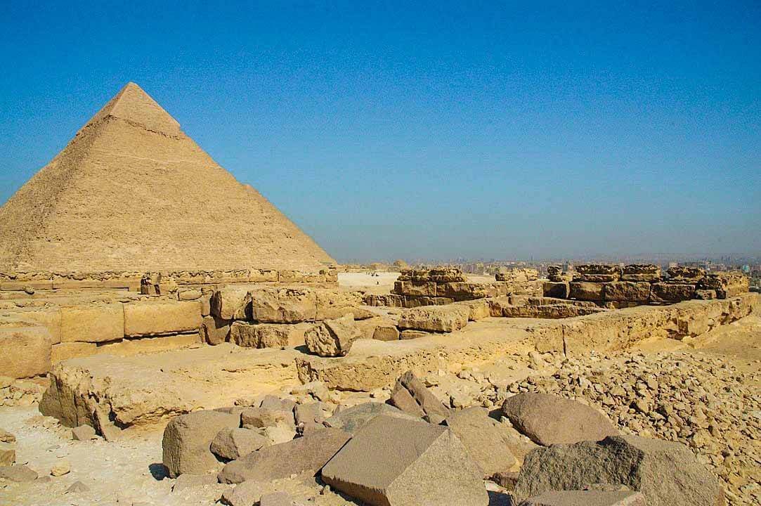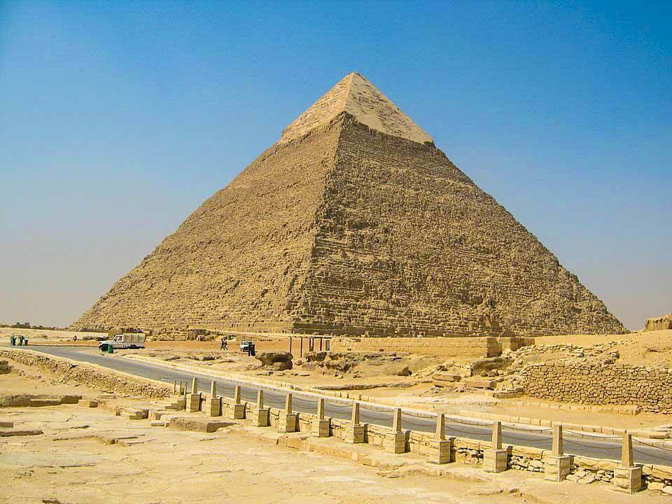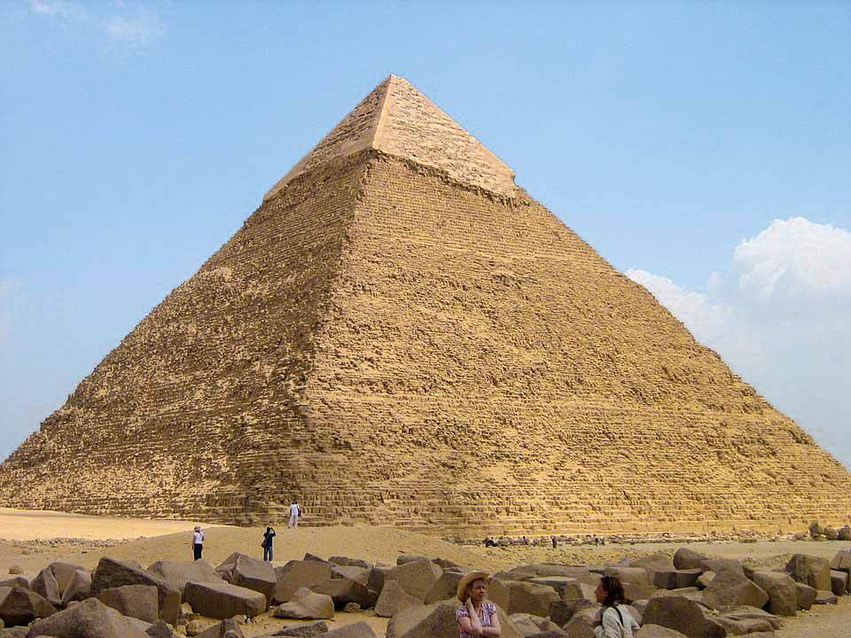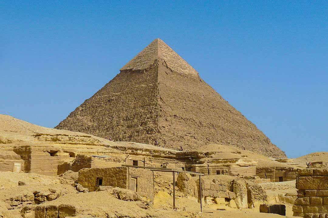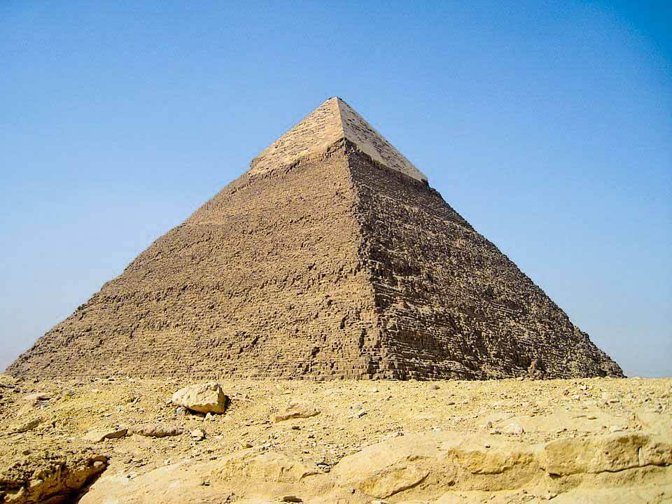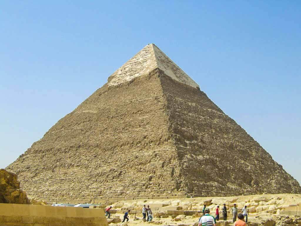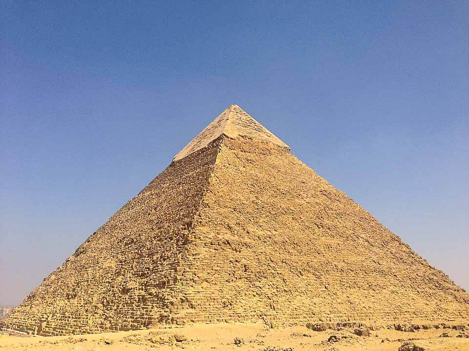 The apex of the pyramid is missing but the peak still has some remnants of its white limestone casing.