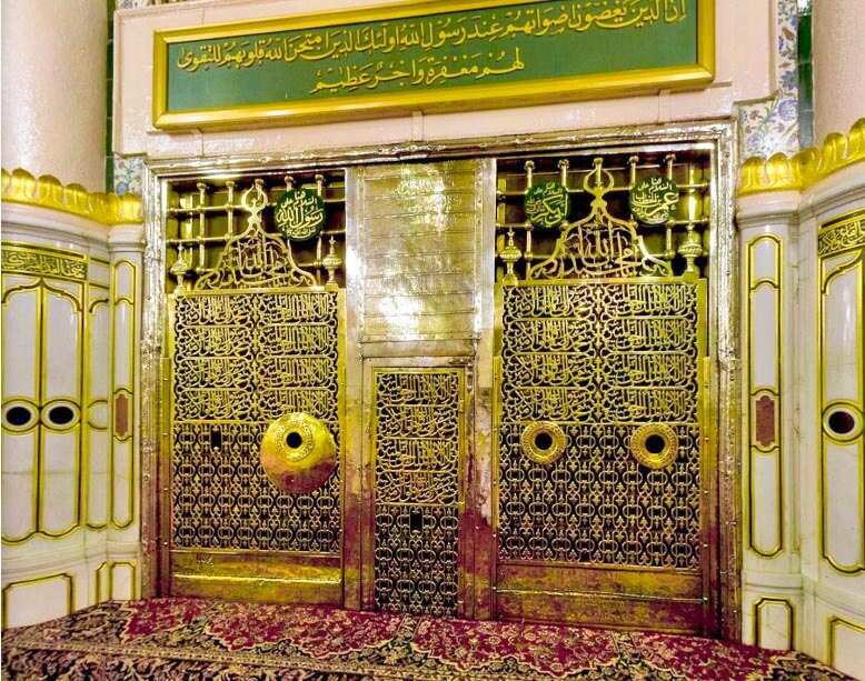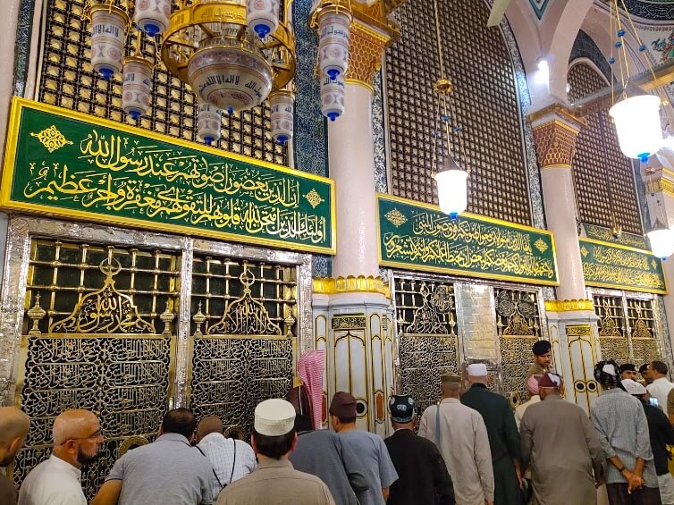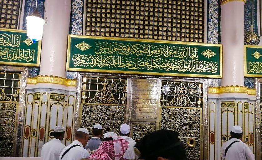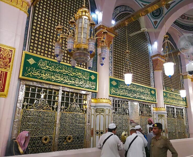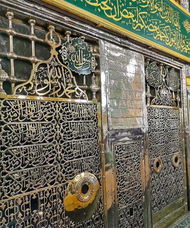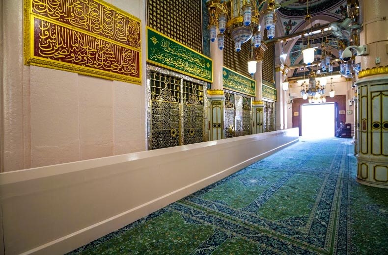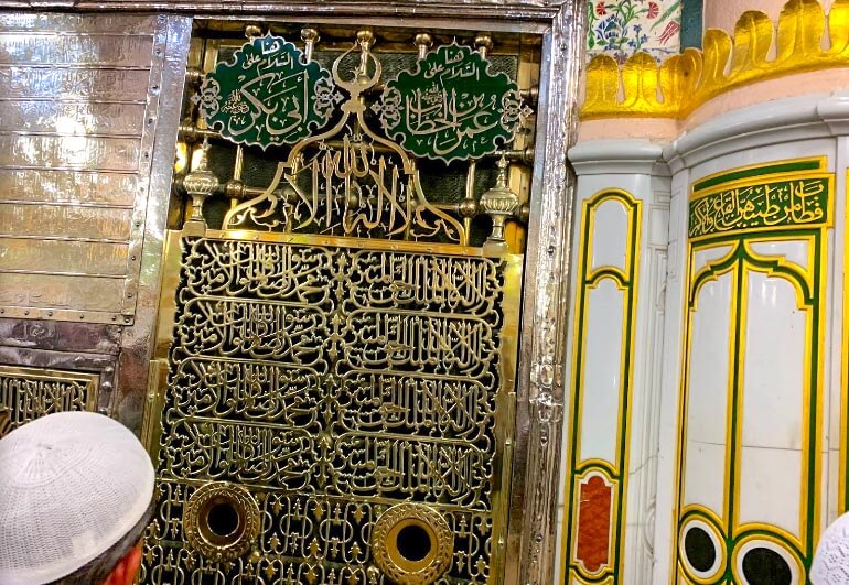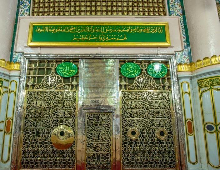 The Prophet ﷺ is buried in the Sacred Chamber, along with two of his most faithful companions and the first two caliphs of Islam, Hz. Abu Bakr al-Siddiq رضي الله عنه and Hz. Umar ibn al-Khattab رضي الله عنه. Once the house (hujra) of Bibi Aisha رضي الله عنها – the house in which he was staying in at the time of his passing away, Today, it forms part of the Masjid Nabawi complex and is the most venerated tomb in the world