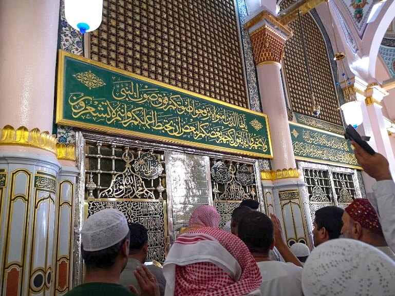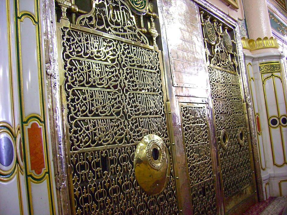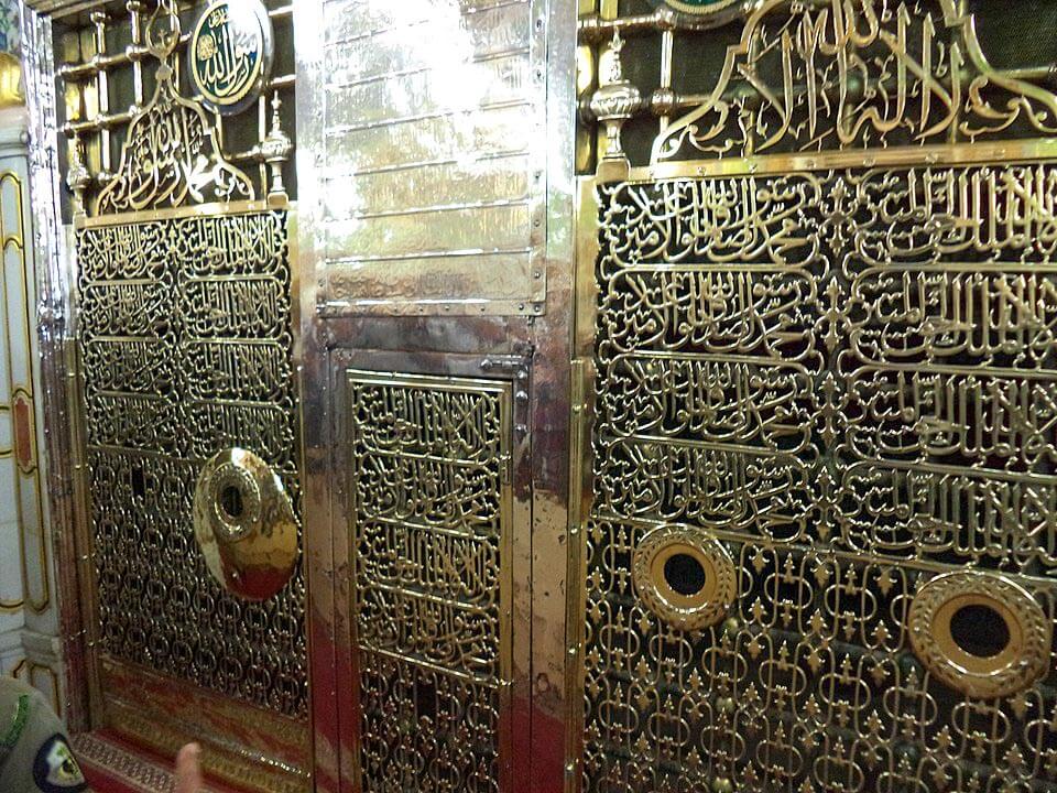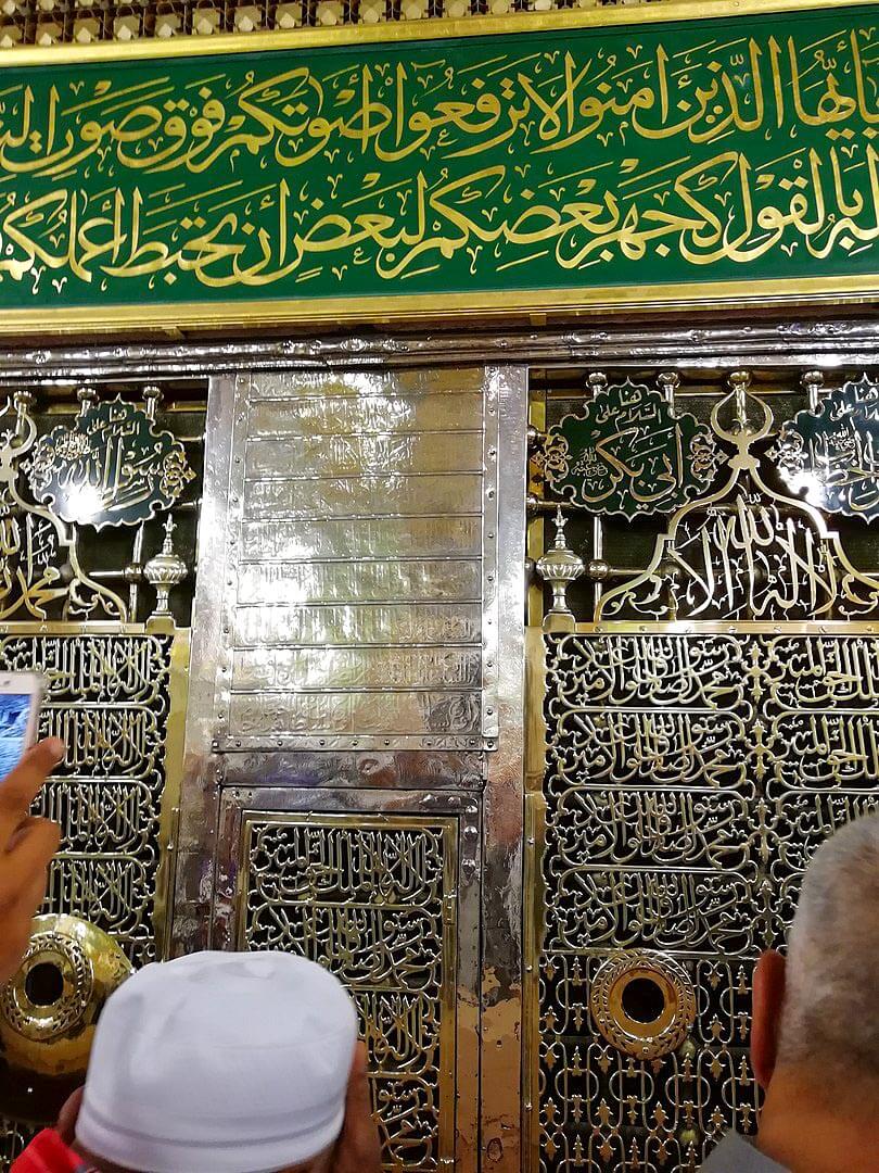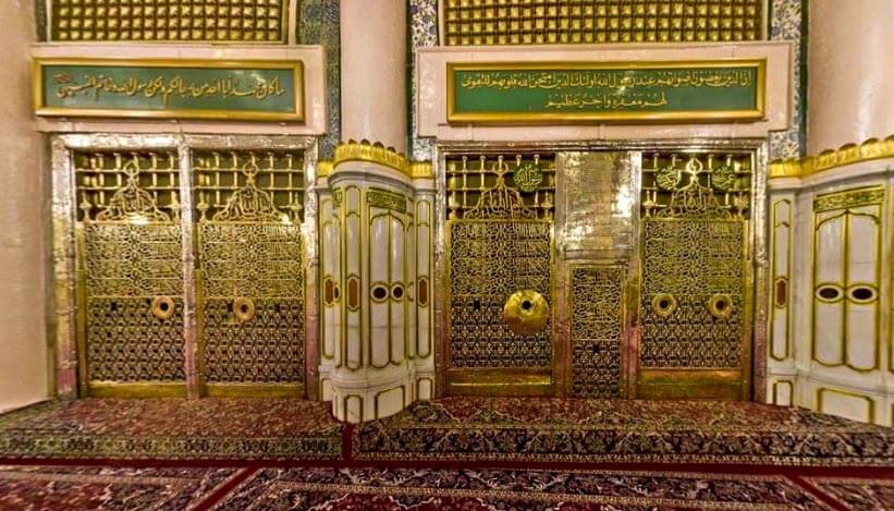 The Prophet ﷺ is buried in the Sacred Chamber, along with two of his most faithful companions and the first two caliphs of Islam, Hz. Abu Bakr al-Siddiq رضي الله عنه and Hz. Umar ibn al-Khattab رضي الله عنه. Once the house (hujra) of Bibi Aisha رضي الله عنها – the house in which he was staying in at the time of his passing away, Today, it forms part of the Masjid Nabawi complex and is the most venerated tomb in the world