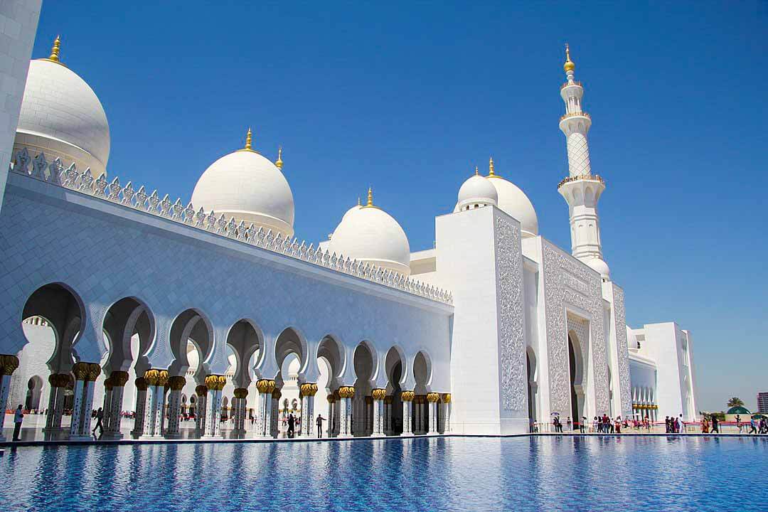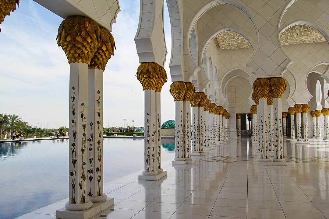 The pools along the arcades reflect the mosque’s columns, which become illuminated at night. The unique lighting system was designed by lighting architects Speirs and Major Associates to reflect the phases of the moon.