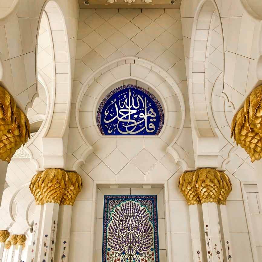The 99 names (qualities or attributes) of God (Allah) are featured on the Qibla wall in traditional Kufic calligraphy, designed by the prominent UAE calligrapher — Mohammed Mandi Al Tamimi.
