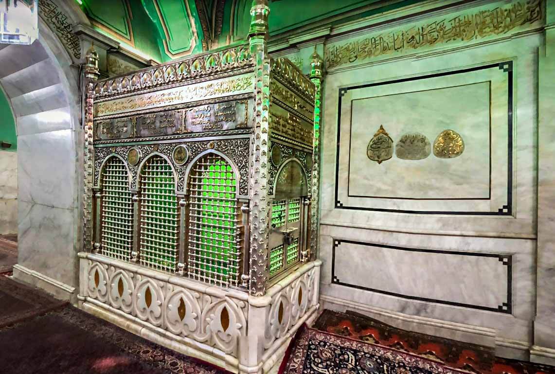 It is located after the mihrab and the mosque of Imam Zayn al-Abidin رضي الله عنه in a 3 by 4 meter room and inside its dome, the names of Imams رضي الله عنهم are written.