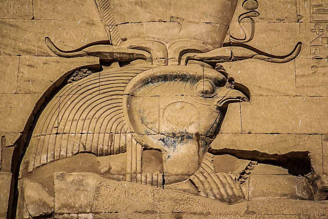 Also known as the Temple of Horus, it dates from 237 – 57 BC during the Ptolemaic Kingdom. During this time of relative prosperity, several Egyptian pharaohs added to the temple’s construction, making Edfu the largest temple dedicated to Horus. According to mythology, Horus, the son of Isis and Osiris, was an important ancient deity known as the Sky God and God of Kingship, among others. Horus is usually shown with the face of a falcon and wearing the double crown of Upper and Lower.