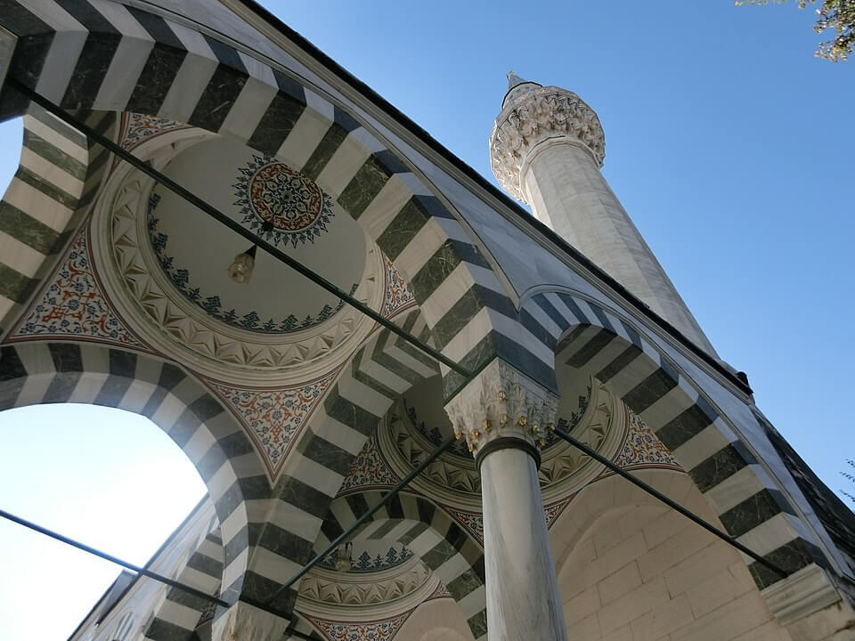 Its main dome is 23.25 meters tall and is supported by six pillars, while the adjacent minaret is 41.48 meters tall.