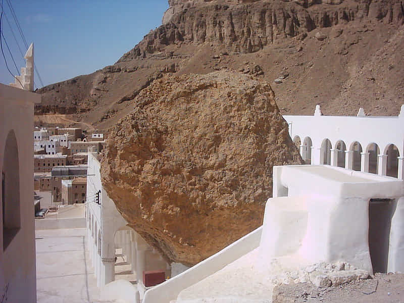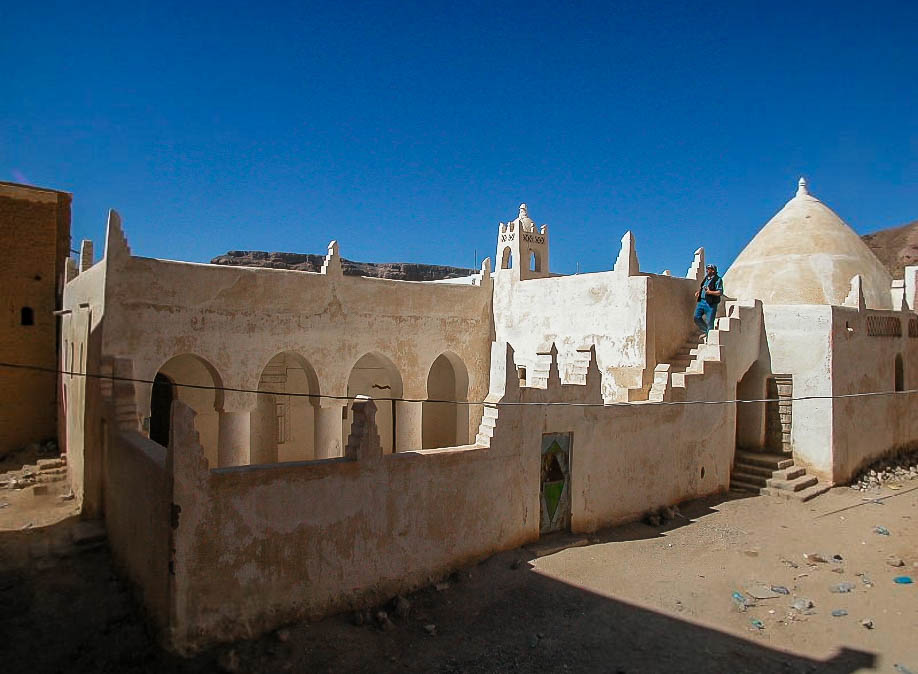 From a distance, the town of Qabr Hud عليه السلام (meaning “Grave of Hud” in Arabic) looks like any other small Hadhrami habitat in the wadi – an assortment of dusty mudbrick buildings situated at the foot of a cliff hundreds of meters high. Qabr Hud عليه السلام is not the exact site where the people of ‘Ad lived – rather, it is where Prophet Hud عليه السلام passed away, many years after the ‘Ad were destroyed. The general landscape consists of brown rocks, desert dust and the surrounding limestone cliffs.