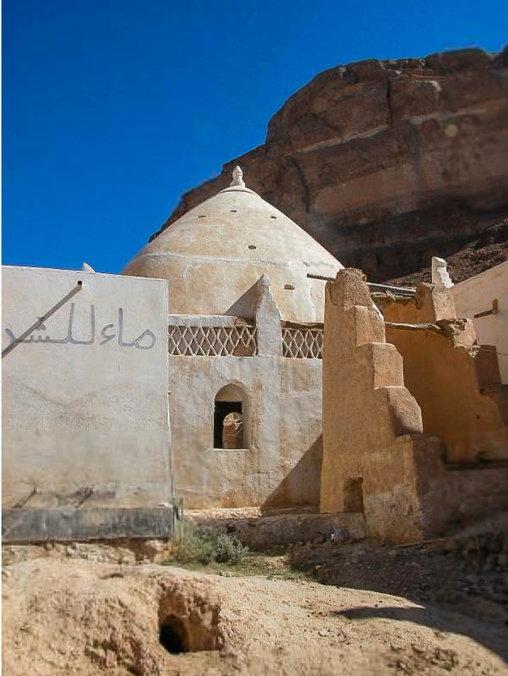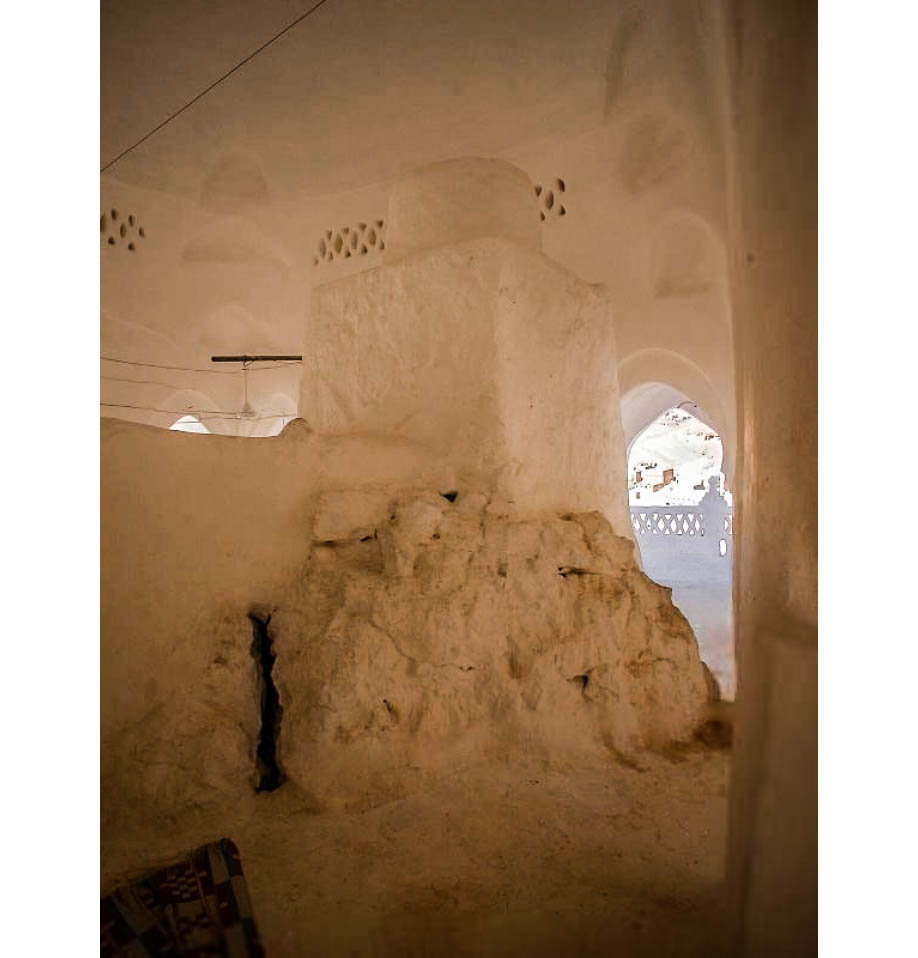 The tomb of Prophet Hud عليه السلام stands at the apex of the town, covered by a dome. The rock tomb itself is more than 30 meters long – local history narrates that the ‘Ad people were of gargantuan build. At one end, a cleft is cleaved into the tomb, and the exposed rock here is touched or even kissed by some of the pilgrims.