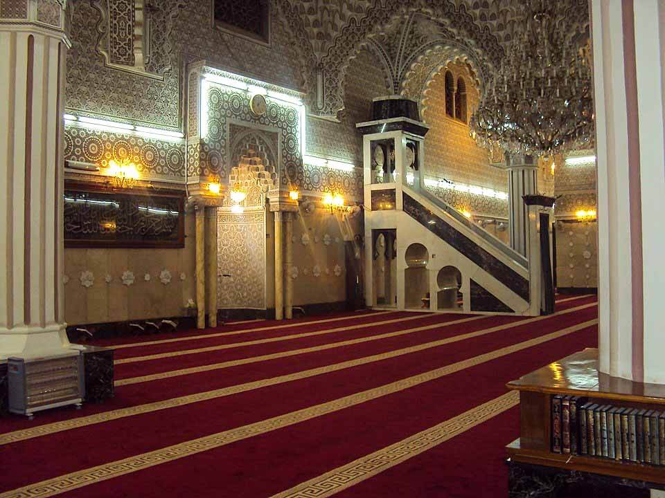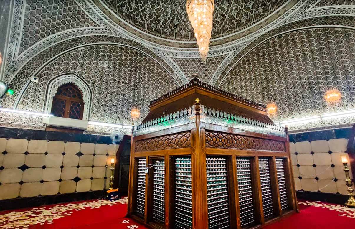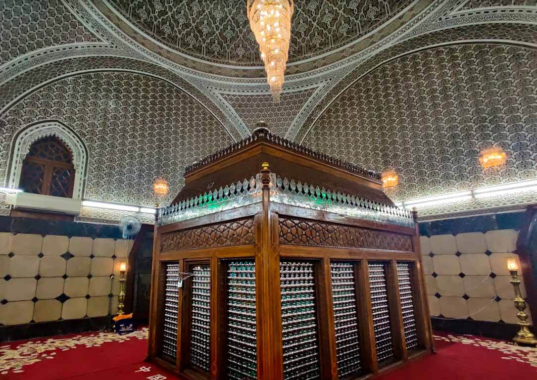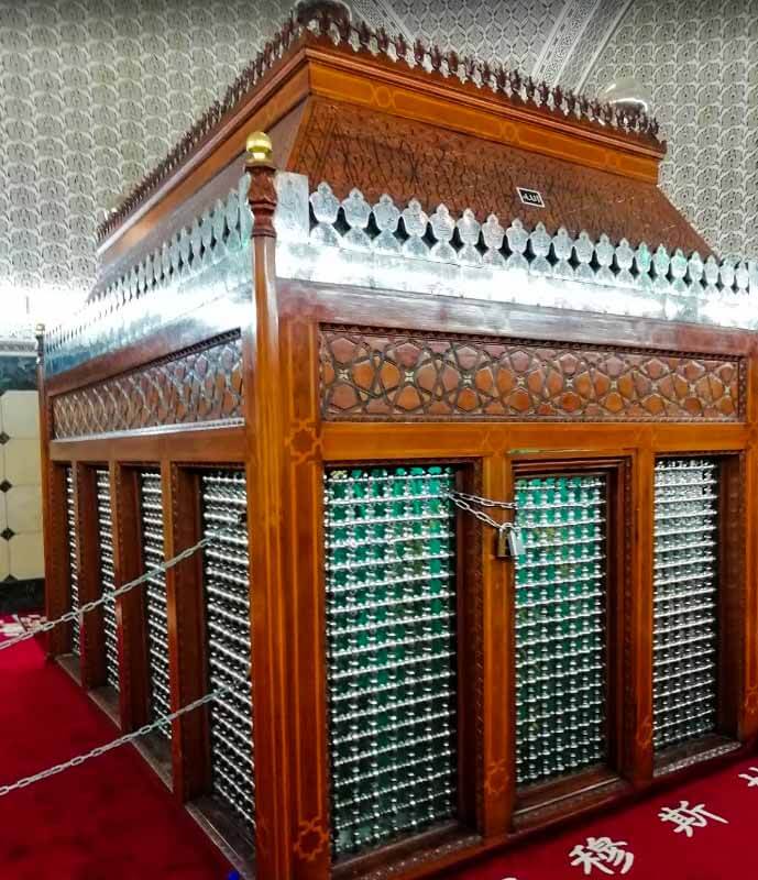 Located under the main dome, the tomb chamber is a wide room. Imam Abu Hanifa رحمة الله عليه is buried in the middle of the room, his grave covered by a wooden Zarih with metal bars.
