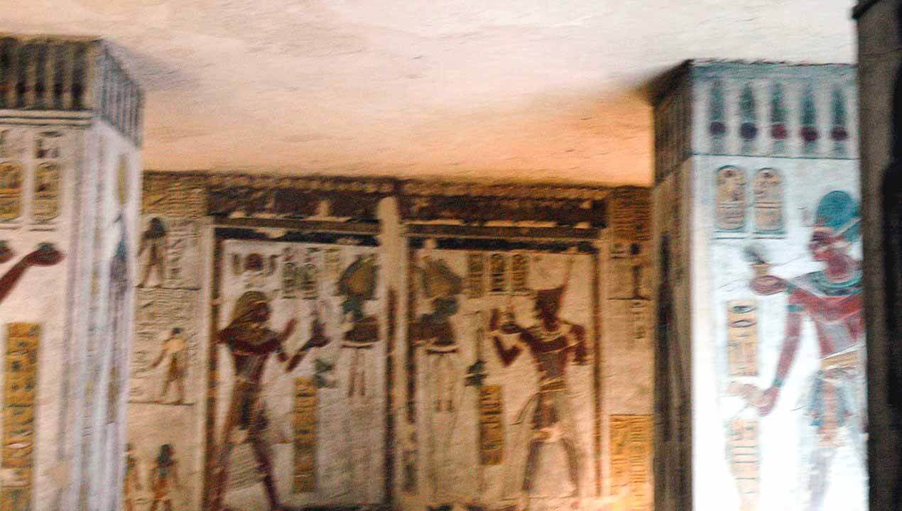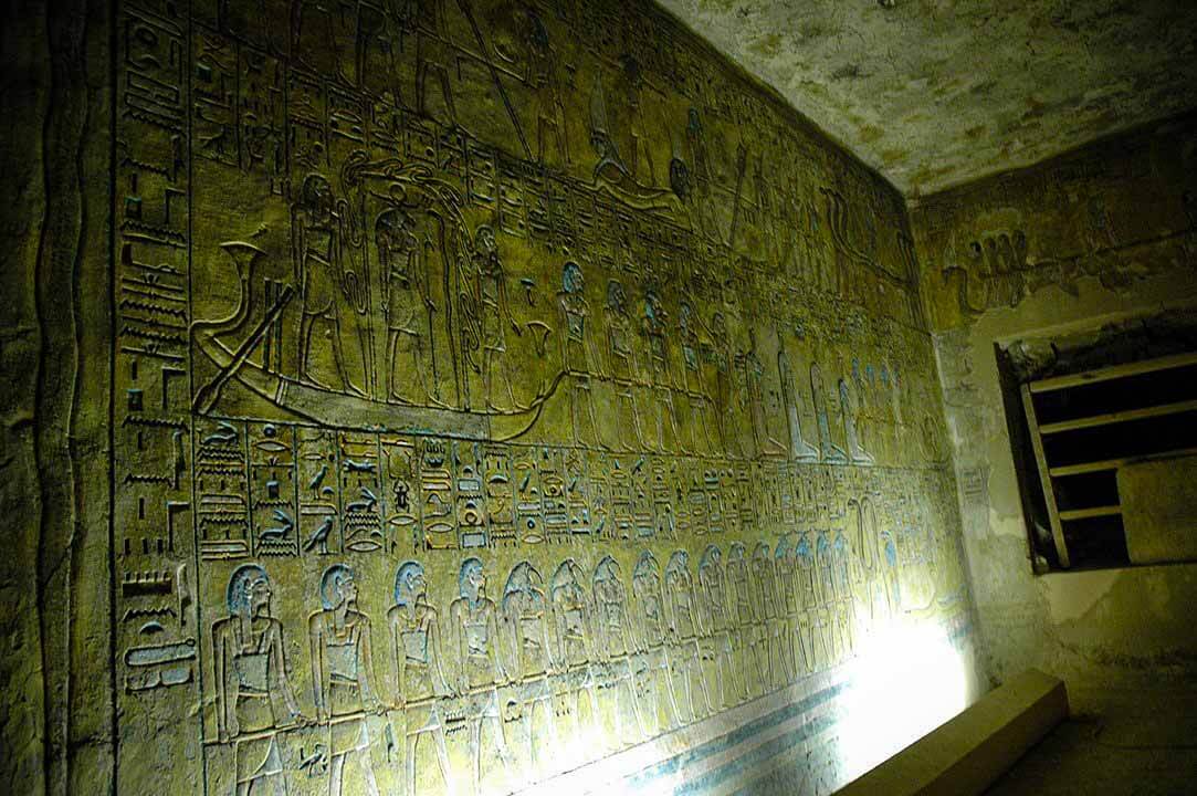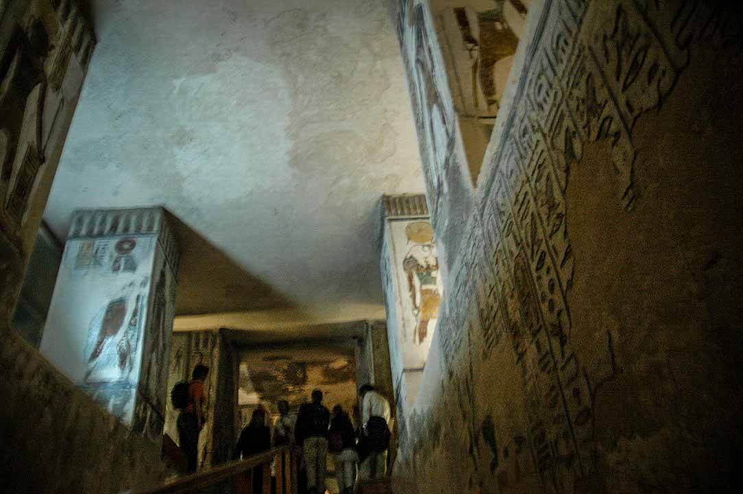 Long passageways adorned with detailed, colorful reliefs and hieroglyphics lead down to the burial chamber. You won’t find Ramses III here. His mummy is in the Cairo Museum and the sarcophagus/lid in museums outside of Egypt.