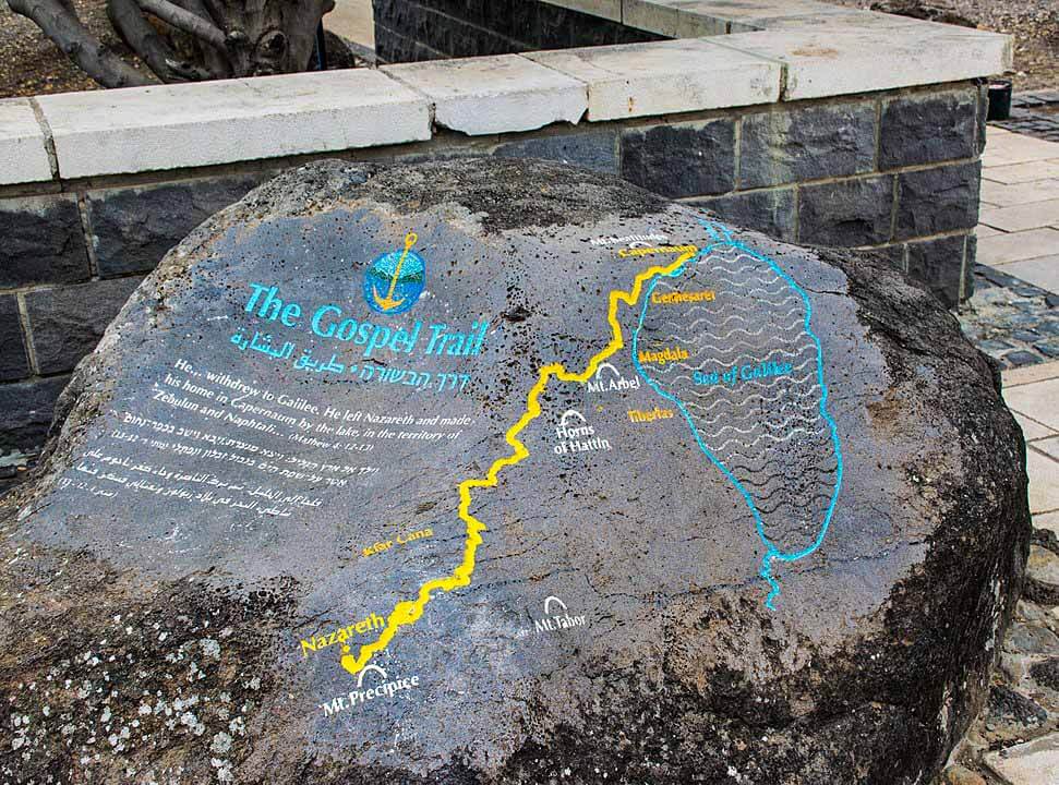 The main part of the trail begins in Nazareth and passes through Sepphoris, Cana (Kafr Kanna), the Horns of Hattin, Mount Arbel Cliffs, the Sea of Galilee, Capernaum, Tabgha, and the Mount of Beatitudes.