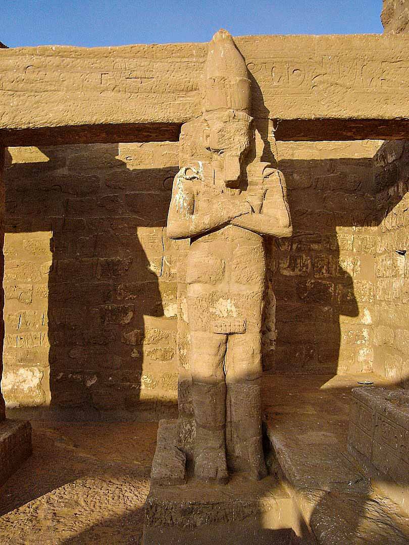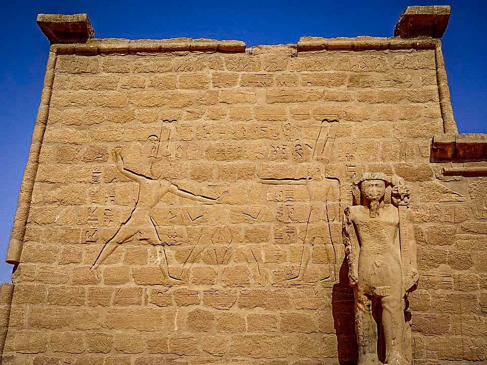 The temple once possessed three pylons. The first two, however, were made of inferior Nile mud brick and have since crumbled. Only the stone gate passageway through them has survived.