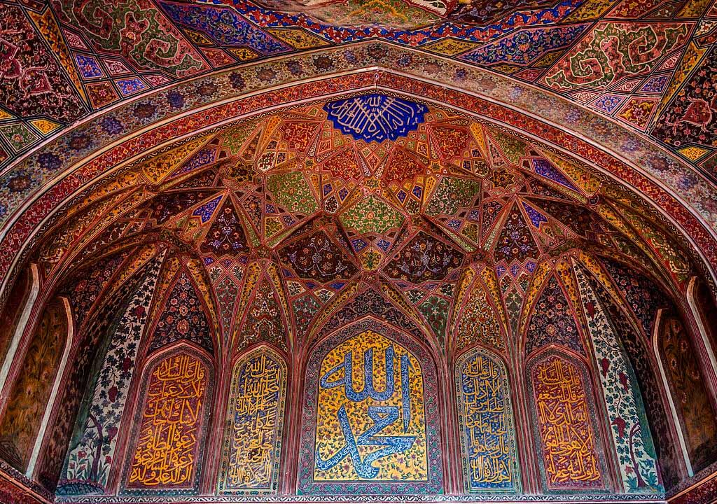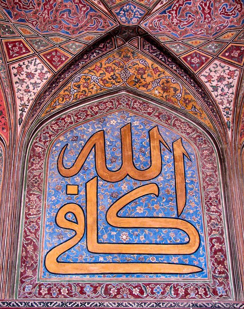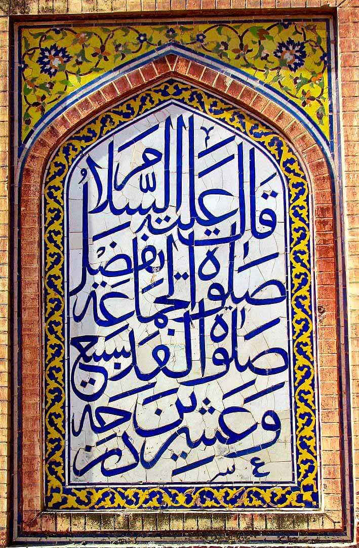The façade of the entry portal facing Wazir Khan Chowk is decorated with elaborate tile work and calligraphy that includes verses of the Quran, verses of the sayings of the Prophet Muhammad ﷺ, prayers for the Prophet ﷺ, and calligraphic insignias. Above the iwan entrance to the main prayer hall are verses from the Quran’s surah Al-Baqara written by the calligraphist Haji Yousaf Kashmiri.