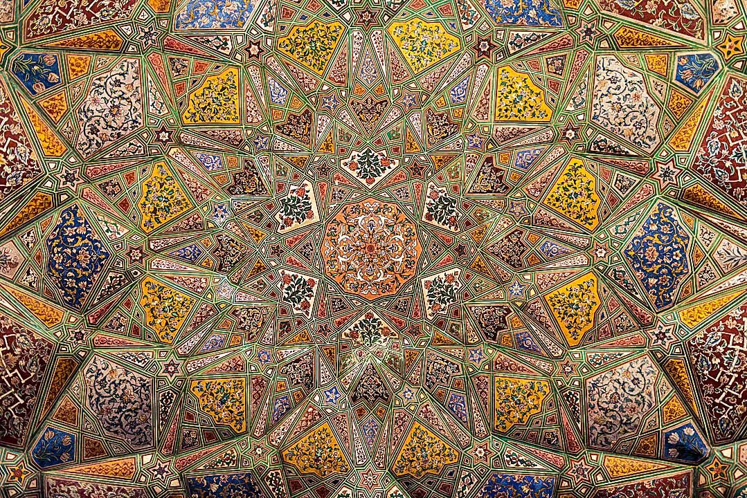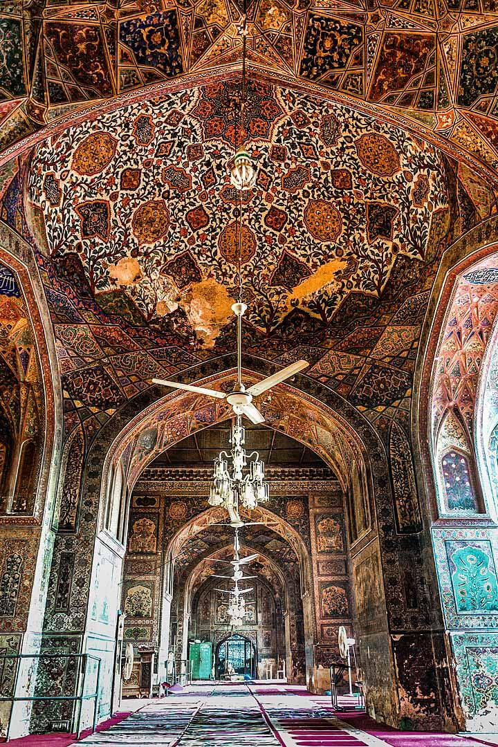 Unlike the contemporary Shah Jahan Mosque in Sindh, the interior walls of Wazir Khan Mosque are plastered and adorned with highly detailed buon frescoes